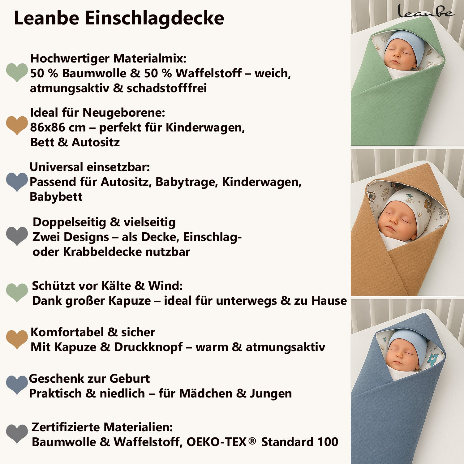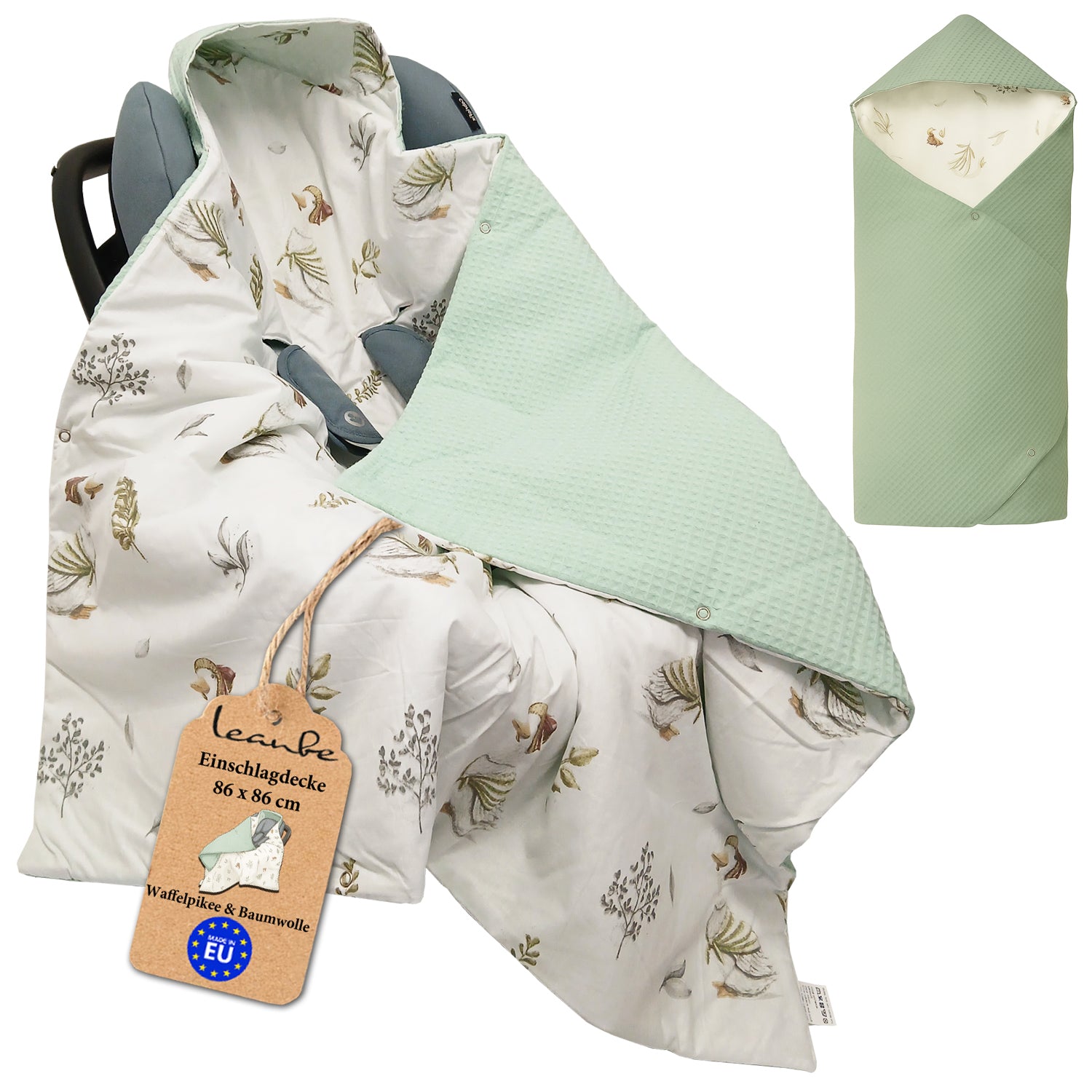 Die Einschlagdecke von Leanbe hat eine praktische Größe von 86 × 86 cm und passt in die meisten Babyschalen, Kinderwagen und Autositze. Sie verfügt über eine große Kapuze und einen Druckknopfverschluss, die das Baby sicher und warm umhüllen.