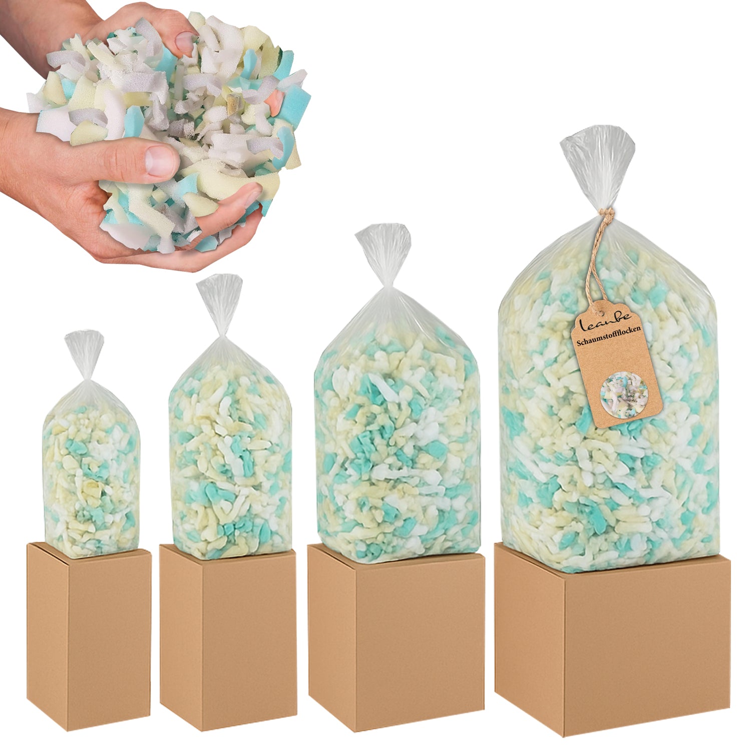 Das Füllmaterial wird je nach Bestellmenge in Sammelverpackungen geliefert. Bitte beachten Sie: Die Farbe kann leicht von den Fotos abweichen, da Faktoren wie Monitorhelligkeit oder Lichtverhältnisse Einfluss haben. Zudem können die Farben der gelieferten Schaumstoffflocken variieren.